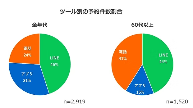 60代以上の利用者でみると、LINEミニアプリが44%、電話が41%。年代が高くなると、配車専用アプリをスマートフォンにダウンロードする操作や手順を難しく感じるという当初の予想と適合する結果となりました。